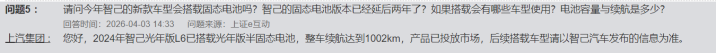 4月3日,上汽集团(600104.SH)回复该提问表示,2024年智己光年版L6已搭载光年版半固态电池,整车续航达到1002km,产品已投放市场,后续搭载车型请以智己汽车发布的信息为准。